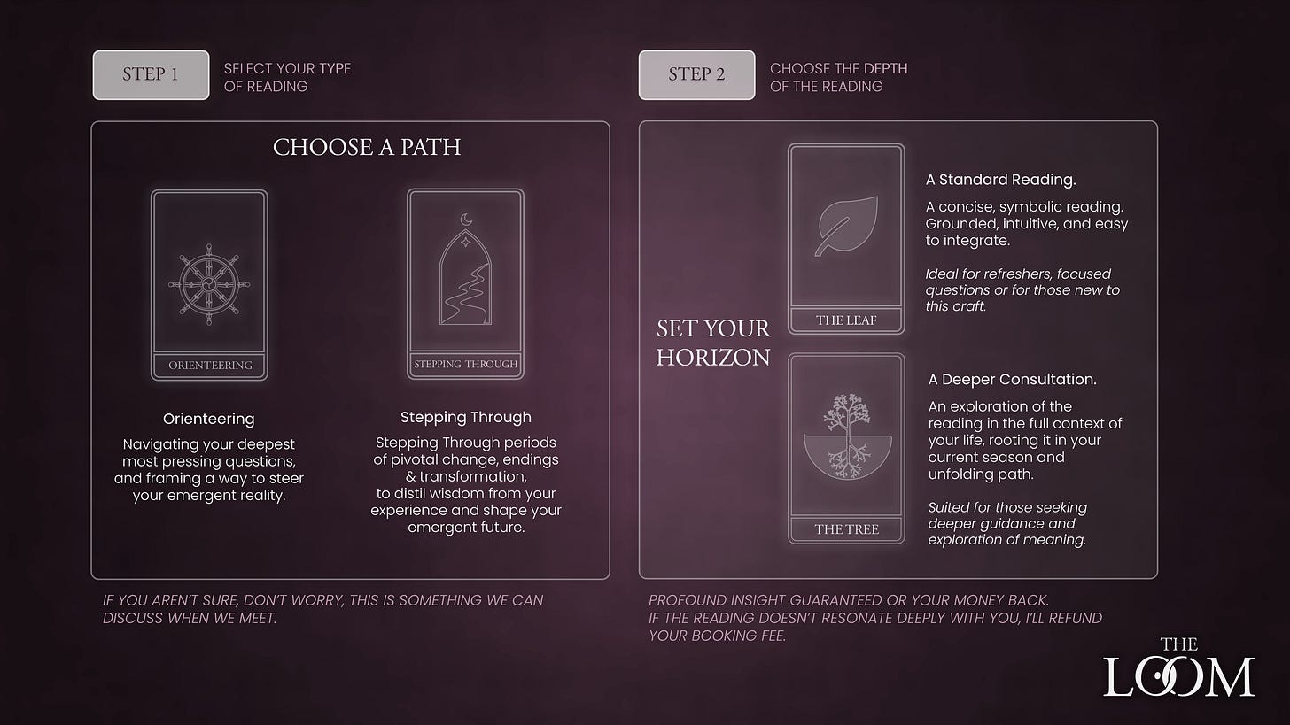 The second is a much deeper engagement that includes a consult, allowing us to integrate the reading more fully into the context of your life. This version is more involved and priced accordingly.